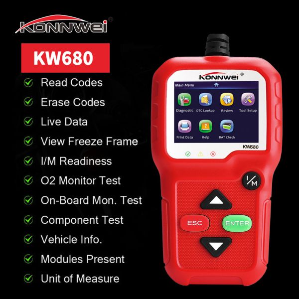 KONNWEI KW680 OBDII/EOBD Scanner supports all 10 modes of OBDII test for a complete diagnosis. Featuring the unique patented One-Click I/M Readiness Key, TFT color display and built-in speaker, the KW680 is truly the ultimate in power and affordability, allowing users to do their jobs faster. In addition, thousands of troubleshooter code tips help technicians to save diagnosis and repair time.